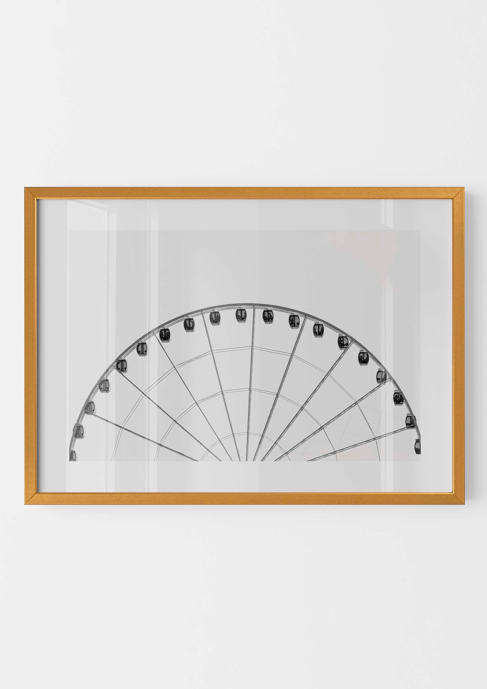 Añade un toque de elegancia y modernidad a tu espacio con este impresionante póster en blanco y negro que muestra la mitad superior de una noria. El contraste sutil entre las líneas geométricas y el espacio abierto crea un ambiente minimalista y relajante, perfecto para el salón, dormitorio u oficina. Impreso en papel de alta calidad, este póster es ideal para los amantes de la fotografía y el diseño contemporáneo.