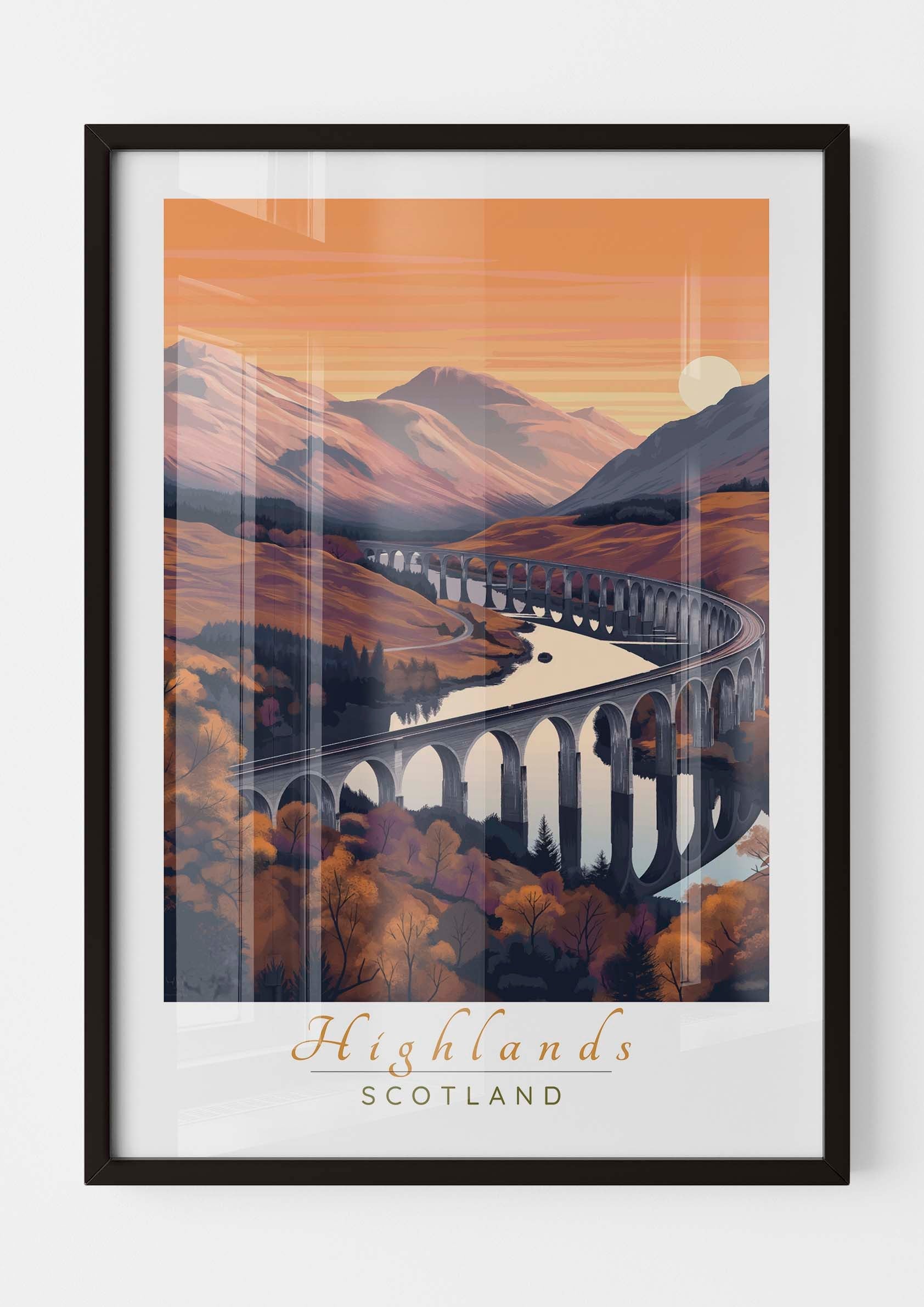 "Highlands" es una ilustración cautivadora que resalta la belleza salvaje y encantadora de los paisajes escoceses. El famoso viaducto de Glenfinnan serpentea sobre un valle dorado por el otoño, mientras las majestuosas montañas se elevan bajo un cielo teñido con los cálidos colores del atardecer. Los árboles de tonos vibrantes y el río resplandeciente crean una atmósfera de serenidad y misterio, evocando la esencia atemporal de las Highlands de Escocia.