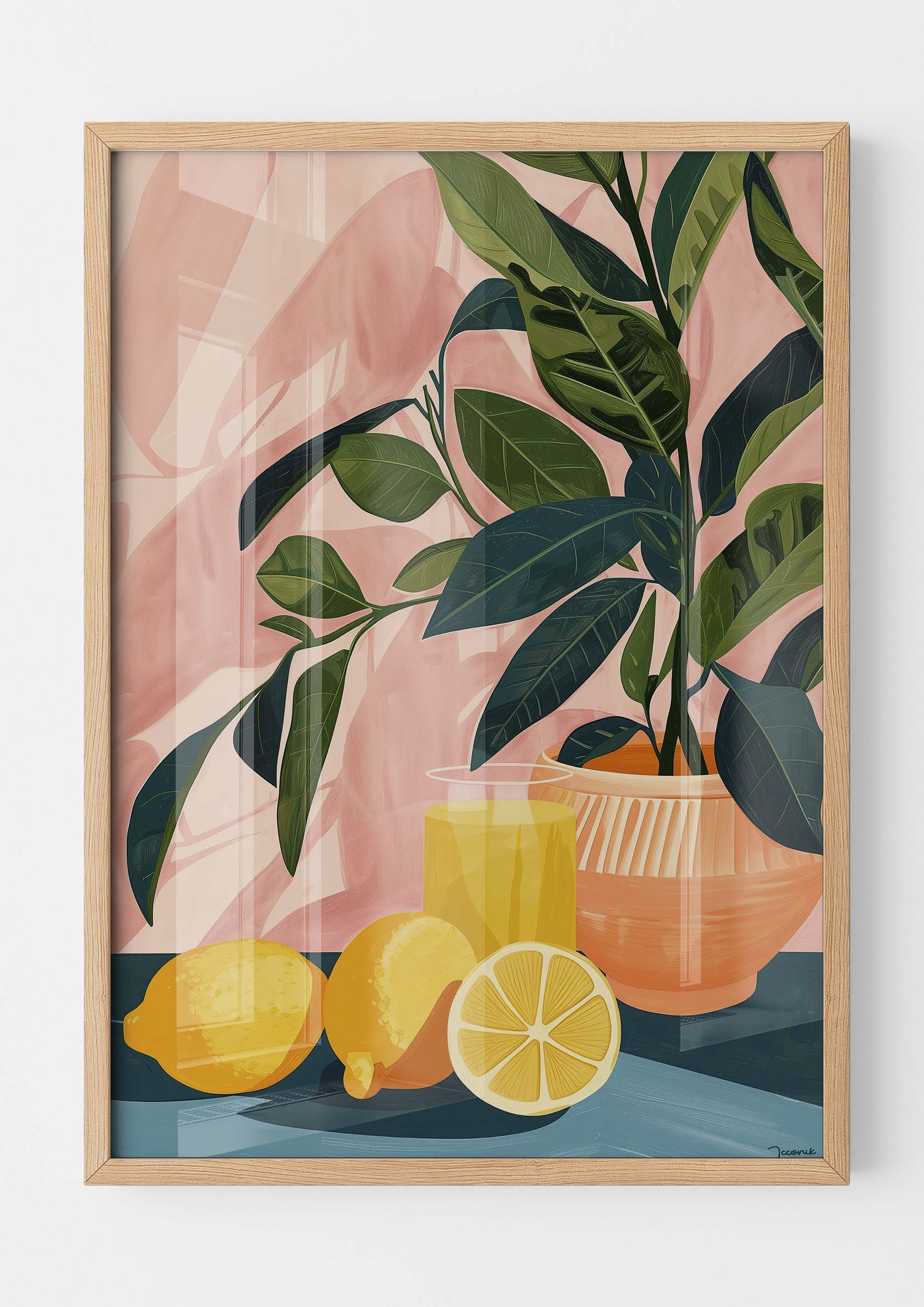 Este póster captura la esencia de la frescura y la vitalidad con su ilustración de limones vibrantes, un vaso de limonada y una exuberante planta verde. Su paleta de colores cálidos y su estilo artístico crean una atmósfera relajante y acogedora, perfecta para cocinas, comedores o espacios con un aire mediterráneo.
