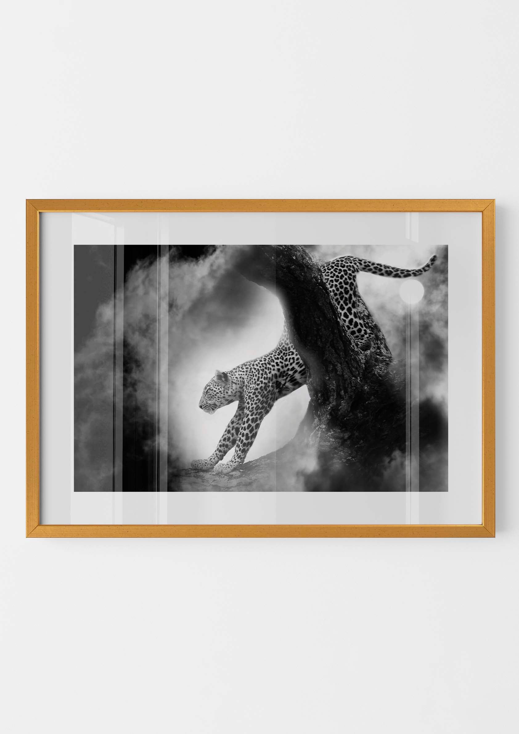 Lleva la fuerza y la elegancia de la vida salvaje a tu hogar con esta lámina en blanco y negro que muestra a un majestuoso leopardo estirándose sobre una rama, rodeado de niebla misteriosa. La composición dramática, realzada por un contraste impactante, captura la esencia de este emblemático animal en un entorno atemporal. Perfecto para los amantes de la fotografía artística y la naturaleza, esta lámina añade un toque audaz y sofisticado a cualquier espacio.