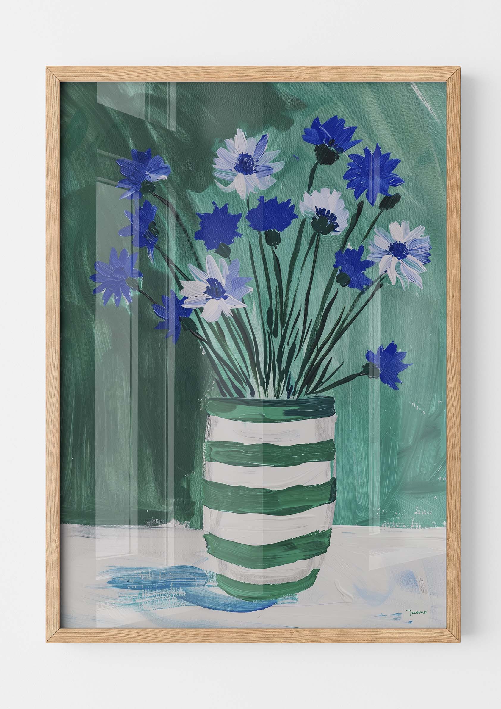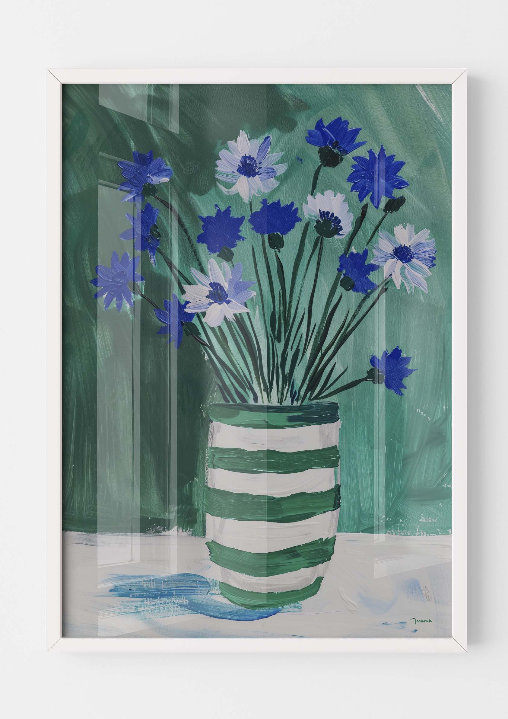 Este hermoso cuadro captura la frescura y la elegancia de los bleuets (acianos), flores de un azul vibrante que evocan la tranquilidad y la belleza natural. Dispuestas en un jarrón de rayas verdes y blancas, estas flores destacan sobre un fondo verde profundo, creando una composición armoniosa y llena de vida.