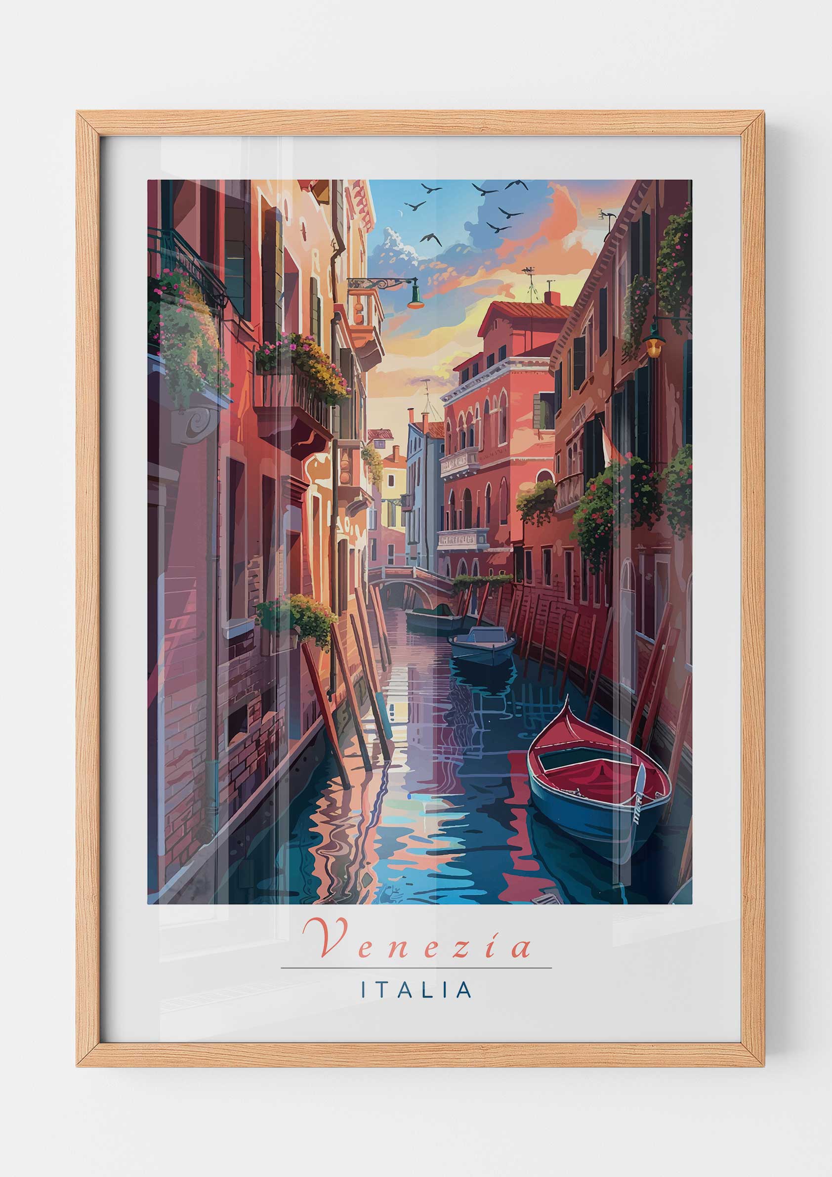 Ilustración artística de Venecia, con sus pintorescos canales rodeados de edificios coloridos y románticos. Un diseño que transmite la atmósfera mágica de esta icónica ciudad italiana, perfecta para los amantes de los viajes, la historia y la arquitectura.