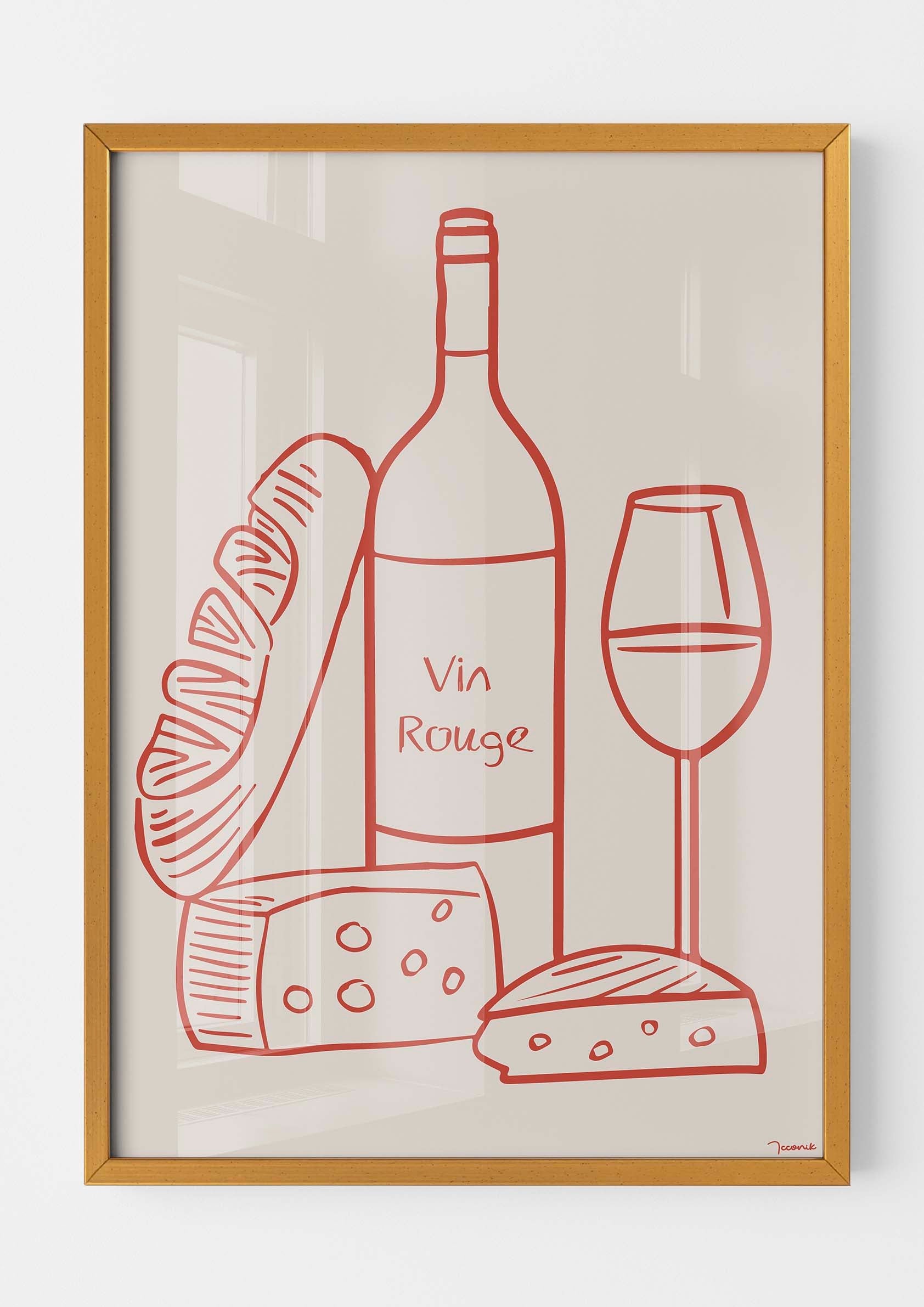Esta lámina celebra el espíritu francés con una representación minimalista de un 'casse-croûte' clásico. Incluye elementos esenciales como una botella de vino tinto, una baguette crujiente y piezas de queso, todo en un estilo lineal y en tonos rojos cálidos. Ideal para los amantes de la gastronomía y la cultura francesa, aporta un toque acogedor y elegante a cualquier cocina o comedor.