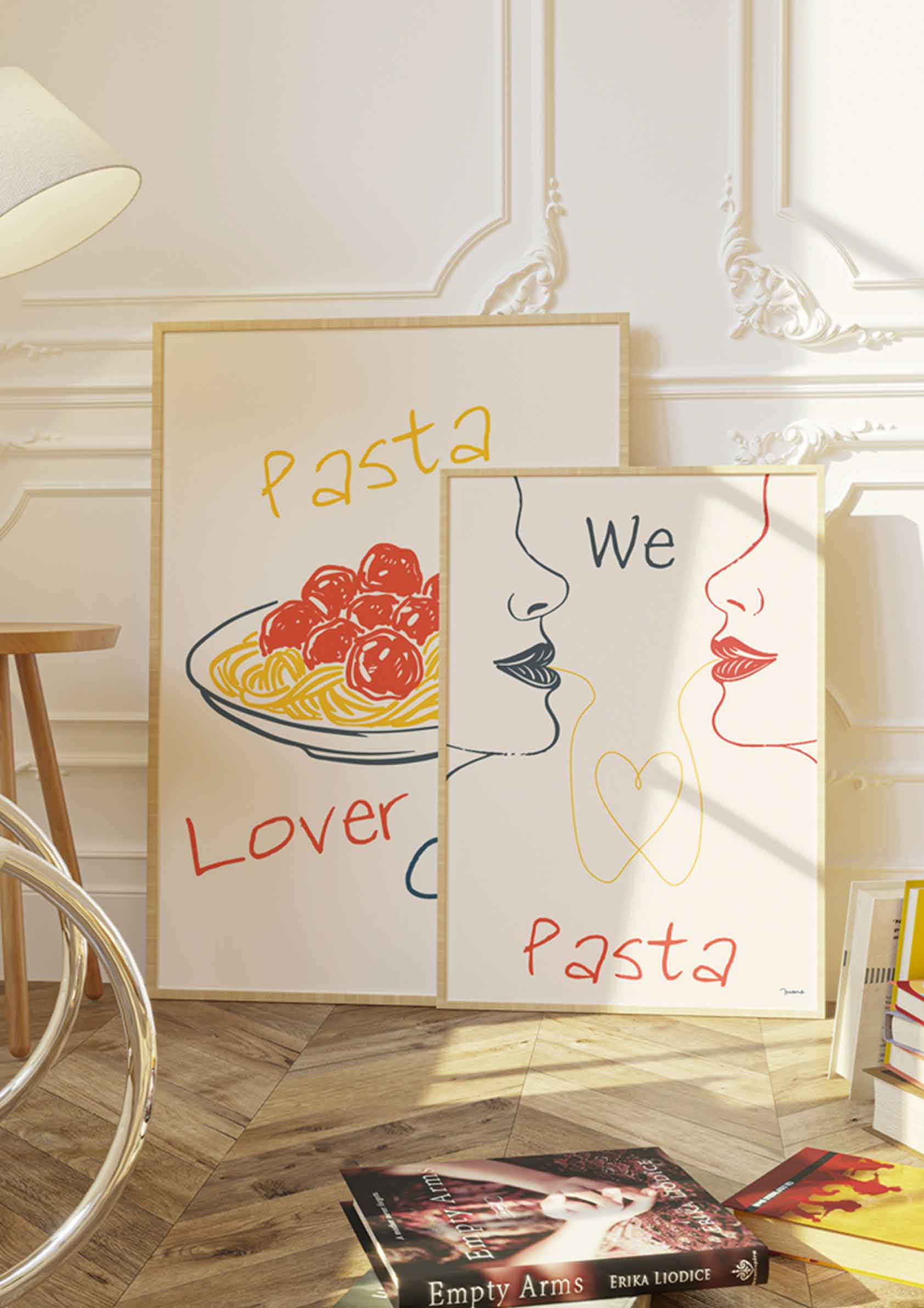 Este póster minimalista celebra el amor por la pasta con un toque artístico y romántico. Dos rostros estilizados, dibujados con líneas simples, se miran mientras comparten un espagueti. El espagueti amarillo forma un delicado corazón en el centro, simbolizando la unión y la pasión por la pasta. El texto "We ❤ Pasta" añade un toque divertido y moderno a esta composición elegante, ideal para los amantes de la cocina italiana y el diseño creativo.